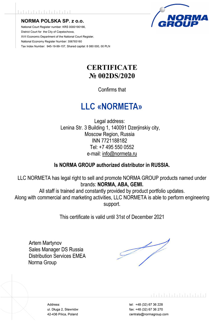 Компания «Нормета» — официальный дистрибьютор NORMA Group в России