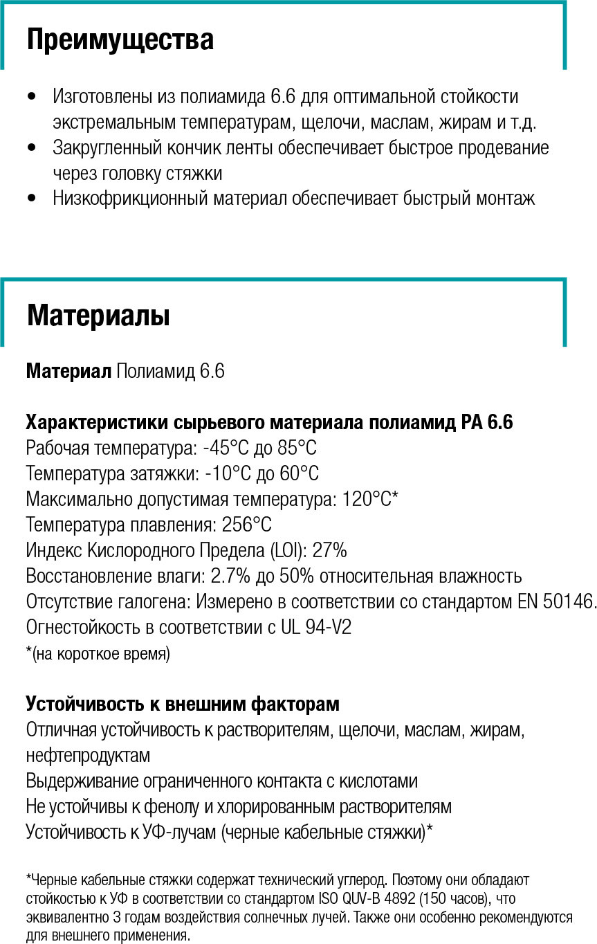 Кабельные стяжки для крепления кабелей в электрических установках, промышленных электропроводках, в автомобилях и т.д. Изготовлены из полиамида 6.6. Устойчивы к экстремальным температурам и многочисленным внешним факторам. Быстрый и безопасный монтаж. Черные кабельные стяжки устойчивы к УФ-лучам благодаря добавлению "технического углерода".