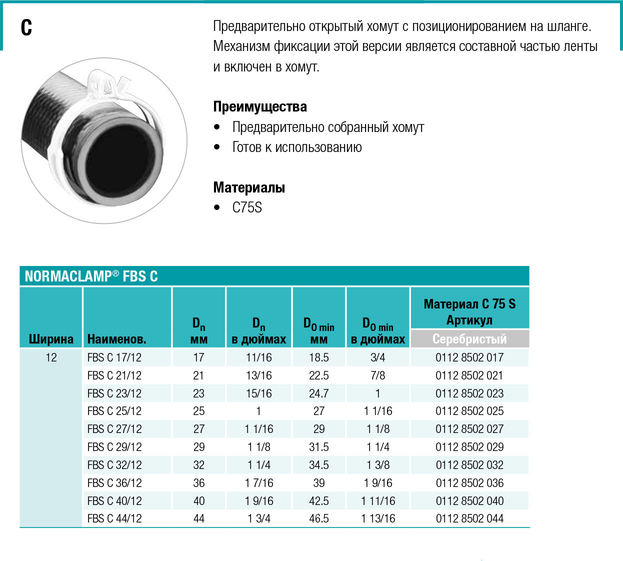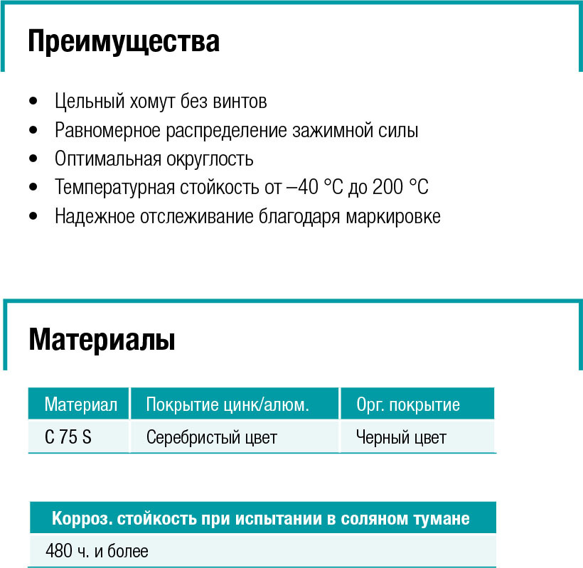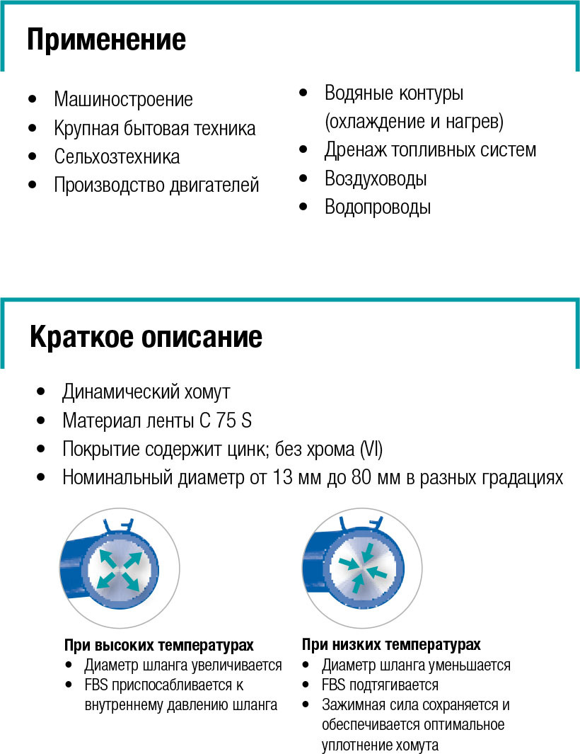 Благодаря особенным динамическим свойствам пружинные хомуты NORMACLAMP® FBS широко используются для систем соединения «шланг – патрубок», подвергаемых сильным перепадам температуры. После монтажа хомут NORMACLAMP® FBS обеспечивает постоянное автоматическое подтягивание шланга. Даже при низких температурах достигается достаточно большая радиальная зажимная сила, обеспечивающая высокую надежность соединения. С помощью хомута NORMACLAMP® FBS также надежно соединяются шланги, подвергаемые сильным перепадам температуры или имеющие склонность к «ползучести». Возможна ручная установка или с использованием пневматического инструмента.