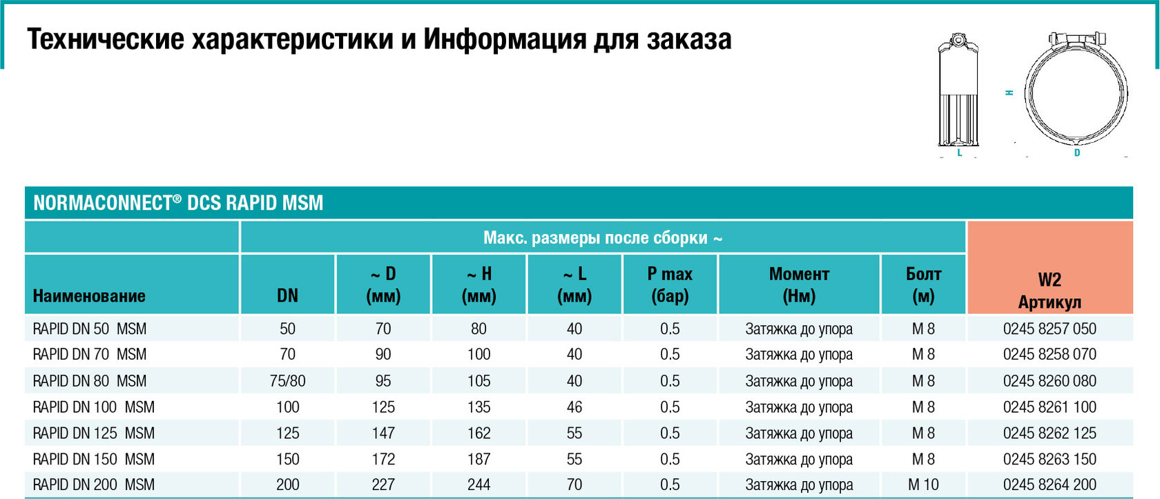 Соединители DCS RAPID MSM отличаются быстротой монтажа благодаря конструкции зажима, поэтому широко используются в ремонтных целях. DCS RAPID MSM применяются для соединений труб, не подверженных продольным перемещениям.